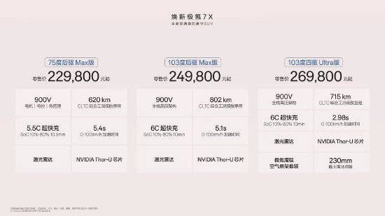 新浪科技讯,10 月 28 日晚间消息,焕新极氪 7X 正式上市,定位家庭豪华 SUV,新车共推 75 度后驱 Max 版 、103 度后驱 Max 版、103 度四驱 Ultra 版三款配置版型,官方零售价分别为 229800 元、249800 元和 269800 元,超级置换权益后限时售价分别为 219800 元、239800 元和 259800 元。