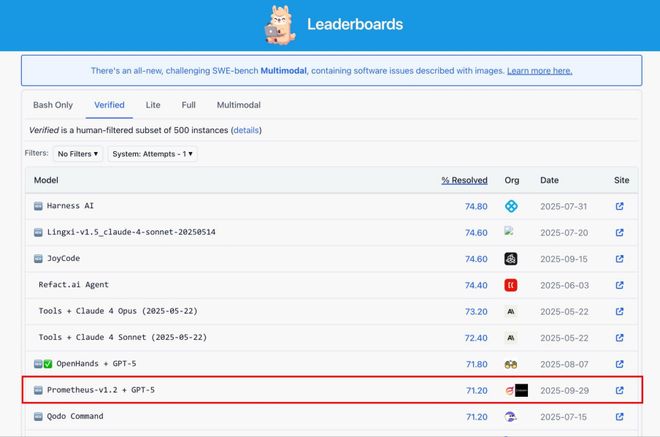 该系统在 SWE-bench Verified 上取得 71. 2% 的 Pass@1 成功率,成绩已被官方确认并合并至主榜单。