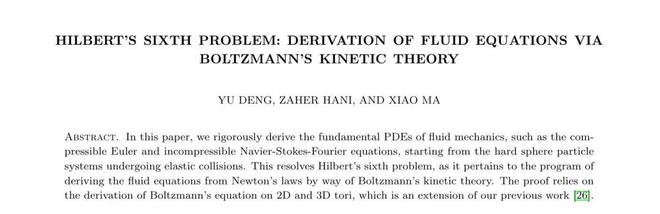 该问题是 David Hilbert 在 1900 年提出的 23 个数学难题之一,其中比较广为人知的包括黎曼猜想、哥德巴赫猜想等,第六题则要求学者从牛顿力学出发,通过玻尔兹曼动力学理论,推导出流体力学中的基本方程。