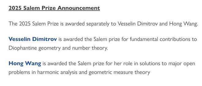 国际数学界的 2025塞勒姆奖,颁发给王虹和 Vesselin Dimitrov。