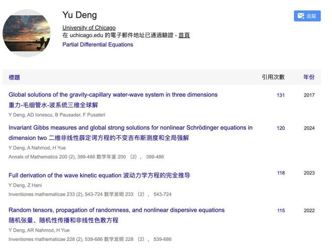 首先是邓煜,现任芝加哥大学教授,毕业于深圳高级中学后,进入北大数院 07 级,在大三时转学到 MIT,并在普林斯顿大学获得博士学位。