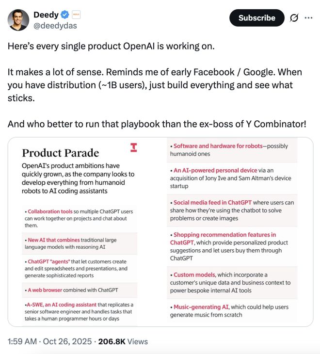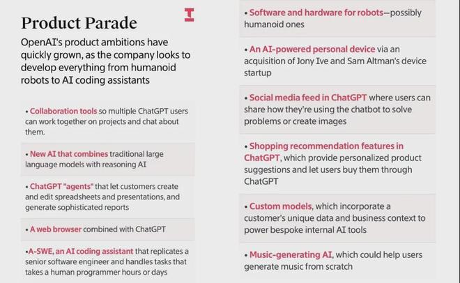 顶级分发渠道(ChatGPT)+ 铺开多条产品线——人形机器人、Agent、个人 AI 设备、社交、浏览器、购物、音乐、定制化模型……啥都有。