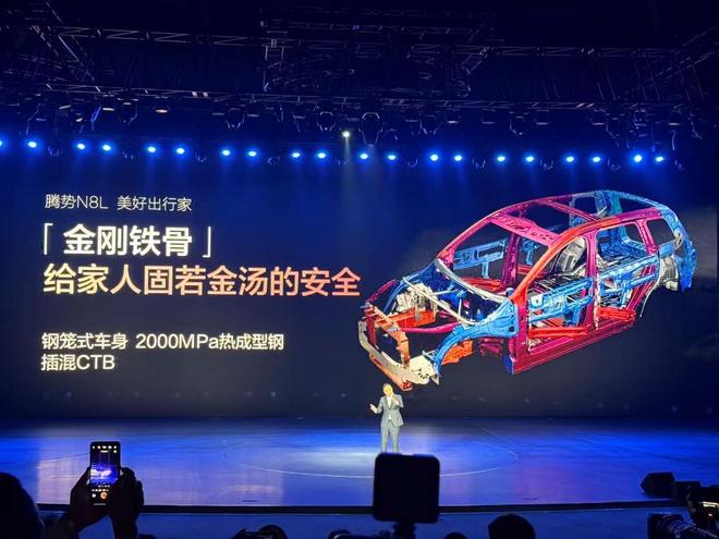 安全性也是腾势 N8L 上的一大亮点,N8L 的钢笼式车身,可以扛住 25 吨大卡车的测压,在车身被动安全上做了保障。