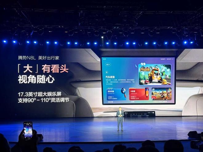 在车辆的第二排,腾势 N8L 还采用了一个 17.3 英寸的大尺寸娱乐屏幕,方便后排乘客观看。