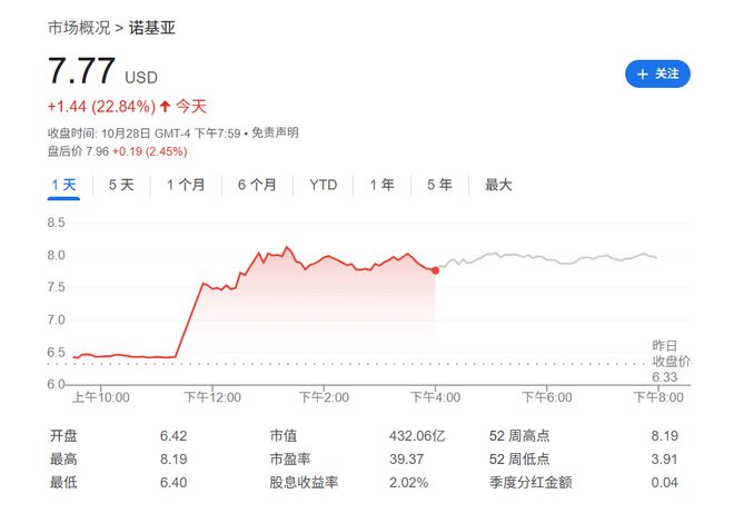 此消息一出,资本市场迅速做出积极反应。诺基亚股价周二收盘飙升超 20%,触及 2016 年 1 月以来的最高点。与此同时,英伟达股价也录得上涨。