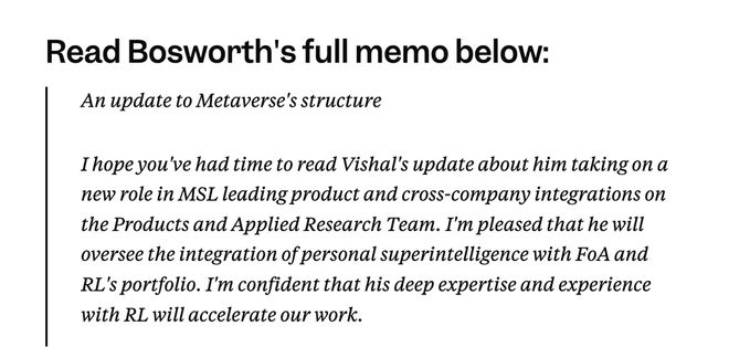 据 Meta 内部备忘录,此次调任,沙阿将担任 Meta 超级智能实验室产品和应用研究部门的 AI 产品副总裁,直接向 AI 产品负责人纳特·弗里德曼(Nat Friedman)汇报,工作重点是将 Meta 的 AI 技术融入到公司的应用平台和可穿戴设备中。