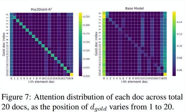 可解释性结果:由于 PB 源自于大语言模型的架构与参数,希望通过分析 Pos2Distill-R1 的内部动态机制来揭示其作用原理并提供可解释性说明。记录当黄金文档从 1 移动到 20 时,对 20 个文档的注意力分布。Pos2Distill-R1 通过动态地将注意力焦点持续对齐到相关文档上,从而强化了上下文一致性,促进了更为准确的检索。