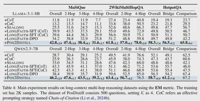 Pos2Distill-R2 实验结果:⽆论是在域内性能还是在域外泛化⽅⾯,Pos2Distill-R2 都超越了现有的⾃我训练⽅法。如表2,在 MusiQue 数据集上训练时,Pos2Distill-R2 实现了 42.8 的精确匹配(EM)得分,优于所有领先的基线。此外,本⽅法表现出强⼤的跨领域泛化能⼒;例如,在 HotpotQA 数据集上,它达到了 58.3 的 EM 得分,⽽最强的基线模型为 50.9。研究结果表明,与传统的逐实例训练相⽐,训练⼤语⾔模型在多样化、分散的⻩⾦⽂档位置上进⾏推理,可能更有效地增强其⻓上下⽂推理能⼒。这⼀洞⻅为提升复杂⻓上下⽂任务中的推理能⼒提供了新视⻆。