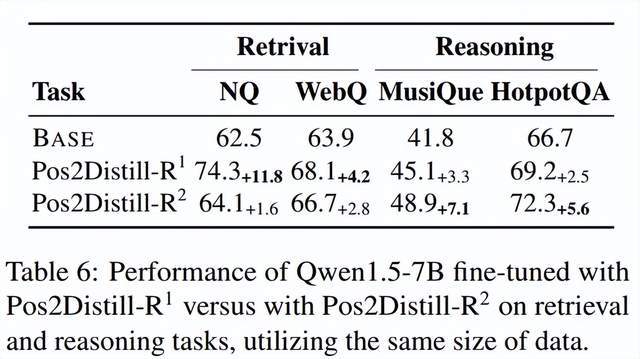 Pos2Distill-R2 在复杂的⻓上下⽂推理任务上取得了更优性能,⽽ Pos2Distill-R1 在这些任务上表现滞后,在检索任务上则反之亦然。