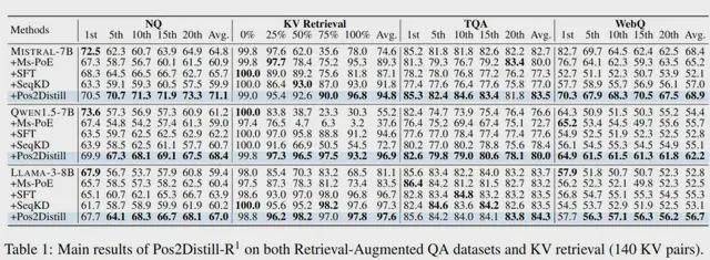 采⽤Pos2Distill⽅法后,模型在⻓⽂本检索和推理任务中的所有位置上都表现出更好的⼀致性,这两个专⻔设计的系统不仅在各⾃对应的任务上表现优异,彼此之间还表现出很强的跨任务泛化能⼒。