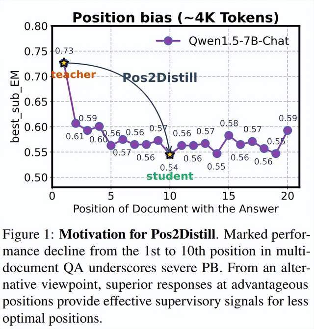 针对这⼀挑战,论⽂提出了 Pos2Distill,⼀个创新的“位置到位置”蒸馏框架。该框架旨在将模型在优势位置的强⼤能⼒迁移⾄劣势位置,从⽽有效缓解位置偏⻅。
