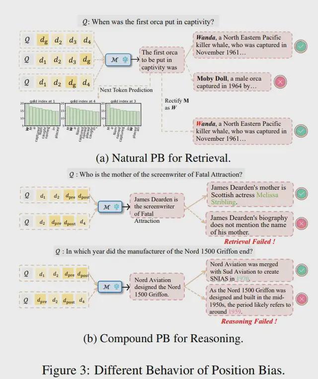 Natural PB for Retrieval:在检索任务 (retrieval)中,PB 主要表现为“词元偏移”(token-shifting),即在黄金文档所处位置不同,大部分的 response 具有相似的前缀,只在关键的生成位置发生分歧,由此诱发 retrieval 的失败。 一旦这些错误的 token 能够被修正,模型又可以输出正确的答案;