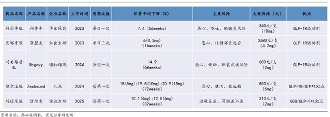 国内已获批减重适应证的 5 款 GLP-1 类药物。界面新闻截自国元证券研报