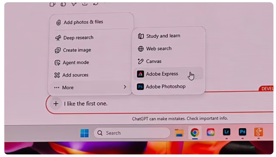 现在,用户在 ChatGPT 界面点击 “更多” 菜单,即可直接调用 Adobe 应用。在全新 “扩展模式” 下,你只需输入如 “把这张照片背景换成夕阳海滩,人物调亮一点” 或 “生成一张科技感十足的 AI 大会传单”,系统便会自动调用 Adobe Express 生成初稿,并支持在 ChatGPT 内直接微调参数 —— 比如调整色调、更换字体、缩放元素,全程无需重复输入指令。