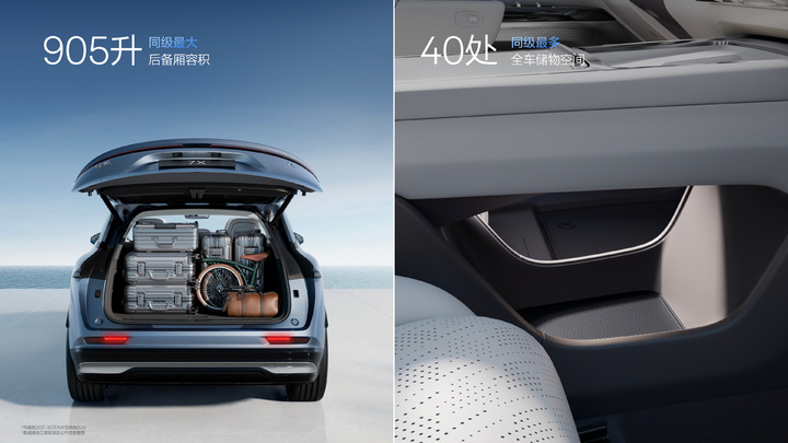 基于 SEA 浩瀚架构打造的焕新极氪 7X,实现了 83.34% 的同级领先得房率。后排腿部空间做到了 1187mm,后备厢容积最大可达 905L,车内设计的 40 处灵活储物空间也充分满足了收纳需求。